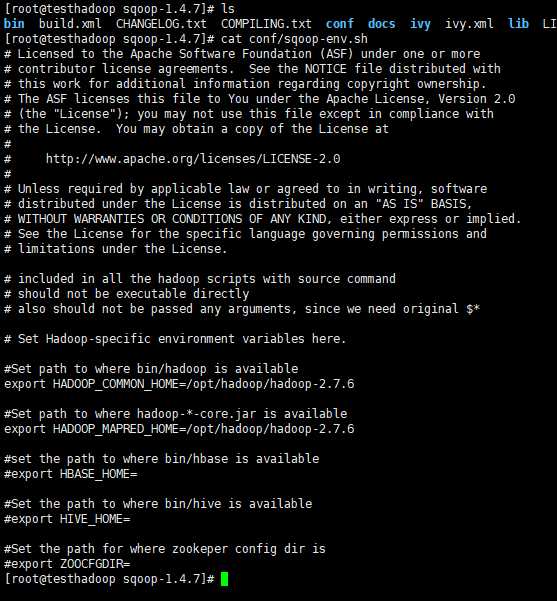 修改conf文件夹下的 sqoop-env.sh 我只配置的hadoop相关的信息,hbase、hive、zookeeper都没有,所以暂时不配置
