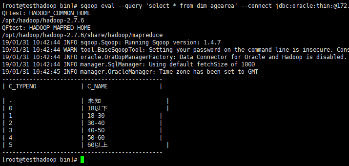 可以看到oracle数据库连接成功。更多指令帮助可以输入 sqoop help 查看。