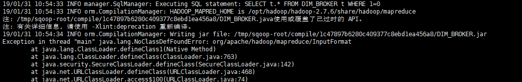 sqoop的lib目录中放好jdbc的jar包就可以关联符合JDBC规范的数据库了,连接hadoop需要mapreduce相关的jar包。上面指定了HADOOP_COMMON_HOME 和 HADOOP_MAPRED_HOME路径。但是在执行sqoop的时候还是抛出找不到class的异常,可能是HADOOP_MAPRED_HOME没有加入到CLASSPATH的原因吧,暂时放一放。