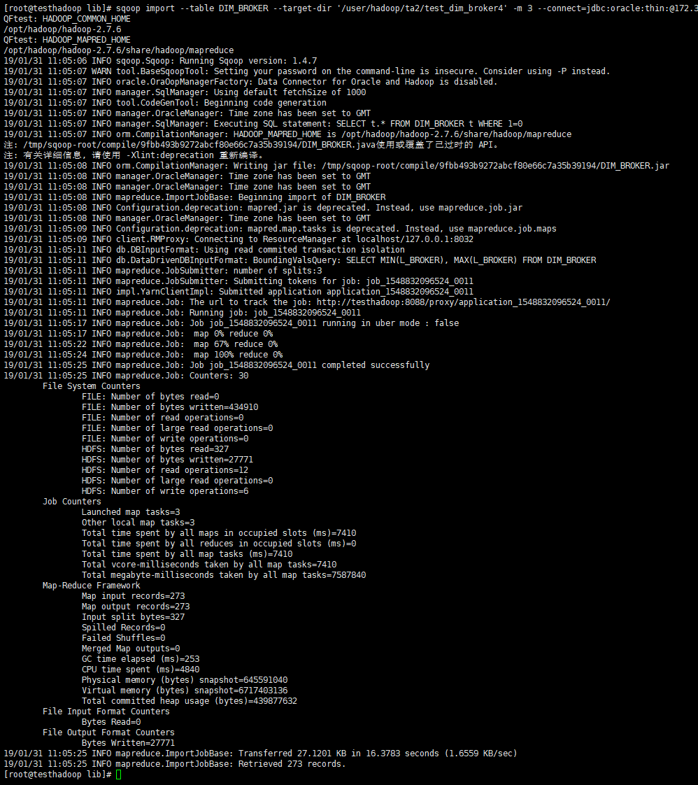 这样,运行sqoop的import指令就能从oracle中拷贝table数据到hadoop的hdfs了。