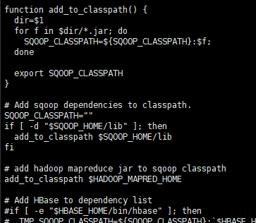 OK,经过检查,在bin/configure-sqoop中确实没有将sqoop-env.sh中配置的HADOOP_MAPRED_HOME路径下的jar包配置到SQOOP_CLASSPATH中。如下图中,add hadoop mapreduce jar to sqoop classpath。。。这两行是我加上去的,功能是将HADOOP_MAPRED_HOME指定的路径下所有jar包都添加到SQOOP_CLASSPATH配置上。