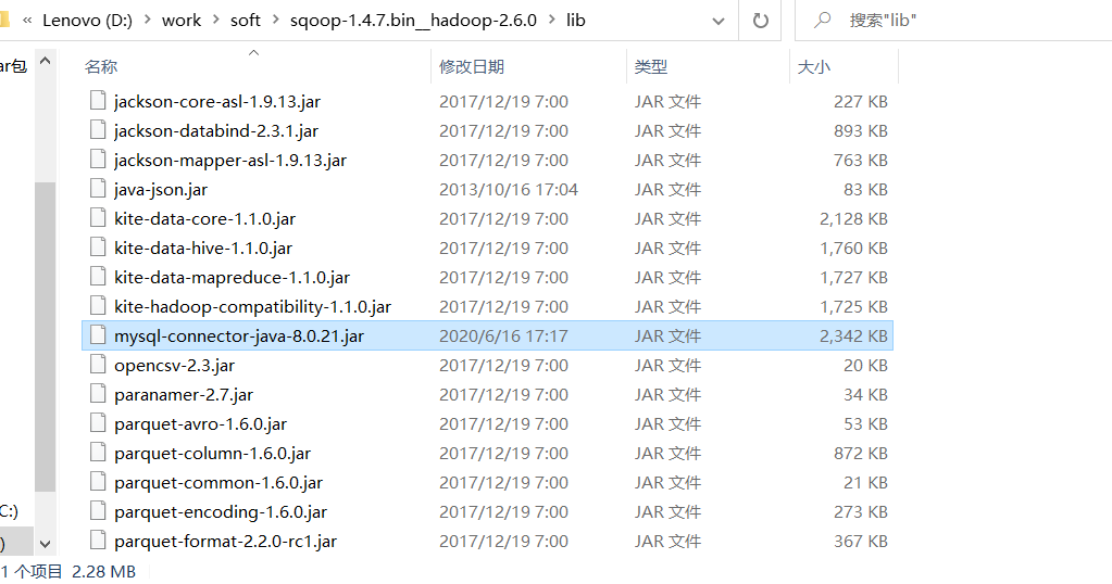 下载和拷贝一个mysql-connector-java-8.0.x.jar到%SQOOP_HOME%/lib目录下: