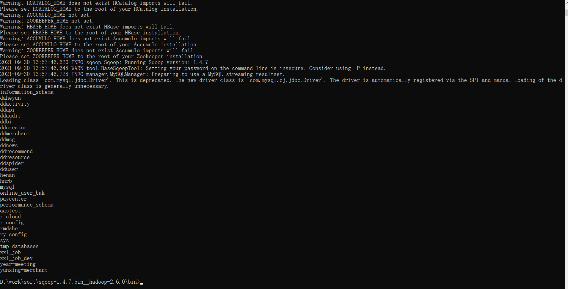 sqoop list-databases --connect jdbc:mysql://127.0.0.1:3306/mydb --username root --password 123456