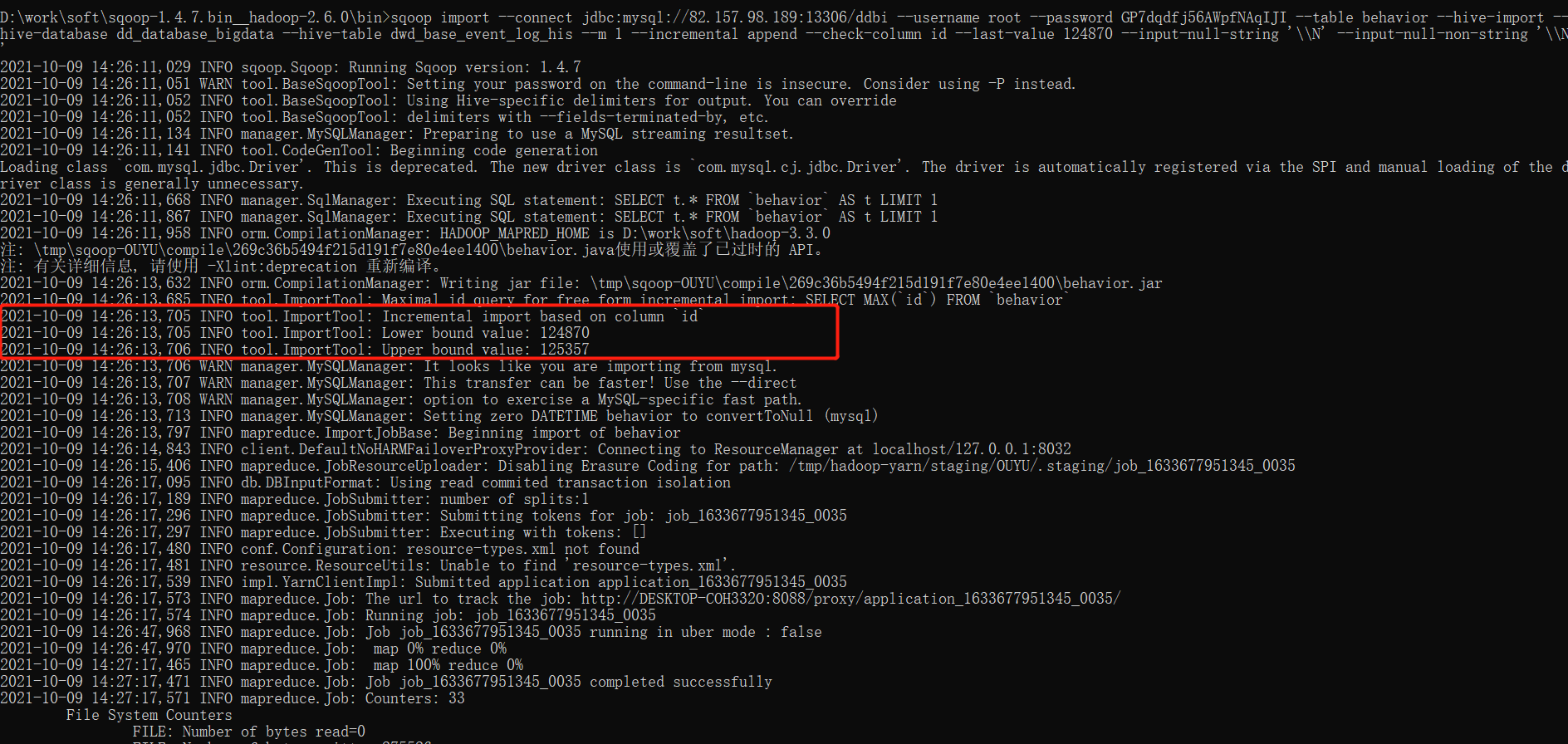 sqoop job --create sqoop_job_behavior_his -- import --connect jdbc:mysql://127.0.0.1:3306/ddbi --username root --password 123456--table behavior --hive-import --hive-database dd_database_bigdata --hive-table dwd_base_event_log_his --incremental append --check-column id --last-value 125357 --m 1 --input-null-string '\N' --input-null-non-string '\N'