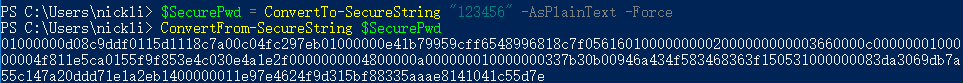$SecurePwd = ConvertTo-SecureString "123456" -AsPlainText -Force ConvertFrom-SecureString $SecurePwd