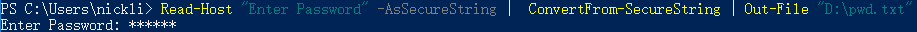 Read-Host "Enter Password" -AsSecureString | ConvertFrom-SecureString | Out-File "D:pwd.txt"