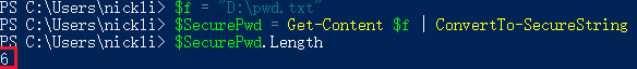 $f = "D:pwd.txt" $SecurePwd = Get-Content $f | ConvertTo-SecureString $SecurePwd.Length
