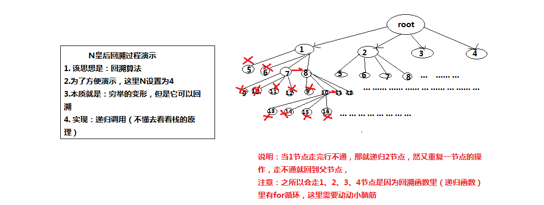 - 放第四个皇后,13. 14. 15. 16都不行,回溯到第三个皇后的10号