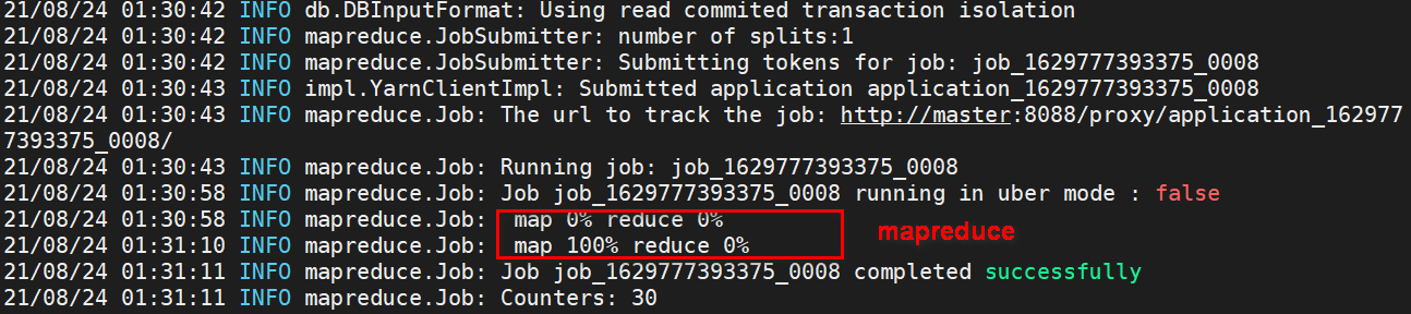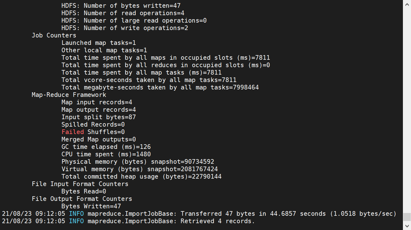 [root@master sqoop]# hdfs dfs -cat /user/tescdata/part-m-00000 1 zhangshan 1 2 lilei 1 3 xiaohong 0bin/sqoop import # 导入数据 --connect jdbc:mysql://localhost:3306/tescdata # 连接mysql --username root # 用户名 --password root # 密码 --table PIM # 表名 --target-dir /user/tescdata # hdfs目录 --delete-target-dir # 如果有就删除(不建议使用) --num-mappers 1 # 指定map数 --fields-terminated-by "t" # 指定文件分割符 -