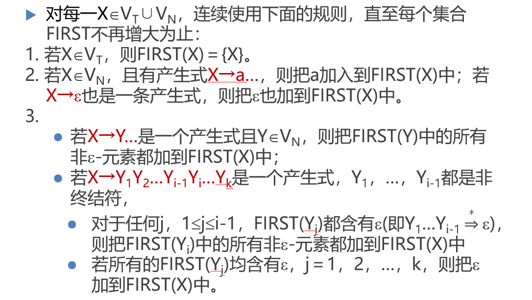 如果a在FIRST(Yi)中,且 ε 在FIRST(Y1),FIRST(Y2),…,FIRST(Yi-1)中,那么a也在FIRST(X)中;
