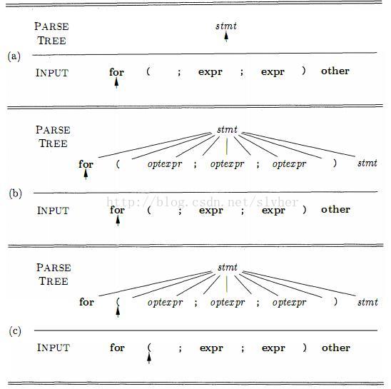 2) 由于输入的是for语句,故选择产生式"for(optexpr; optexpr; optexpr) stmt"进行推导,此时lookahead符号指向终结符号"for",如上图最上面部分的(a)所示。用for产生式中的符号构造root节点的子节点,构造后的分析树如上图中部的(b)所示。