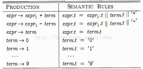 我们的目标是把简单数学表达式的中缀形式翻译成后缀形式,假设给定的语法制导定义如下(其中,左边为文法产生式,右边为附加的语义规则,这些规则定义了从infix到postfix转换的语义规则):
