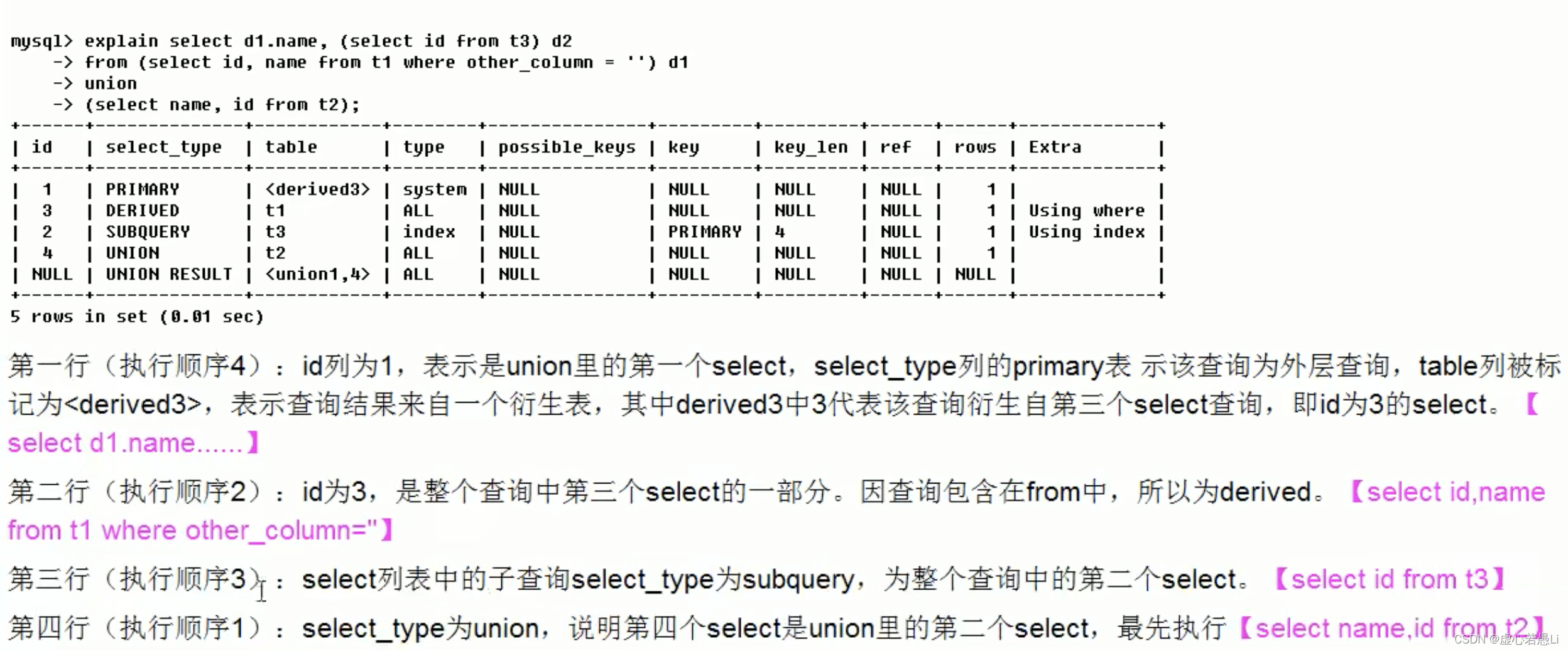 table:当前数据是属于哪张表的 ,derived+id是临时表