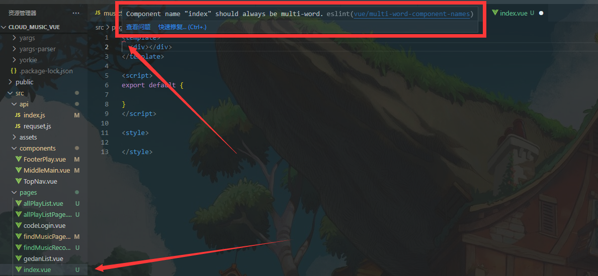 比如如上图我创建了一个index.vue的文件,但是他在一开头就会报错,解决方法如下: