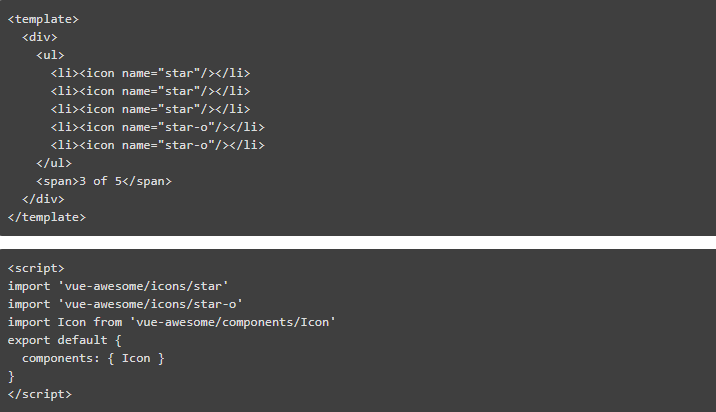 Vue.js 使用原生 ES6 模块来处理依赖和导出组件。<script>块中的前两行分别导入图标,所以最终捆绑包中不需要图标。第三个图标是从 vue-awesome 导入的 Icon 组件,所以你可以在你的项目中使用它。