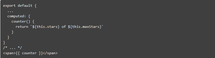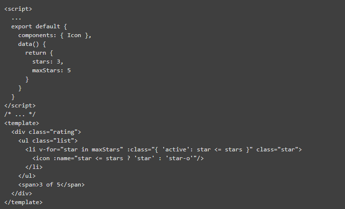 Vue.js 带有一堆指令,可以让您将演示逻辑添加到模板中,而无需将其与纯 JavaScript 代码混合。v-fordirective 遍历任何可迭代的对象(数组,对象文字,映射等)。它也可以把一个数字作为一个范围重复 x 次、这就是我们用 v-for="star in maxStars" 所做的,所以我们对组件中的每个星星都有一个<li>。