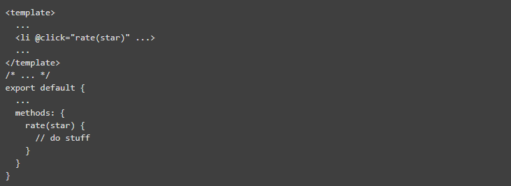 我们在 <li> 上添加了 @click 属性,这是 v-on:click 的简写。该指令包含对我们在组件的 methods 属性中定义的 rate 方法的调用。