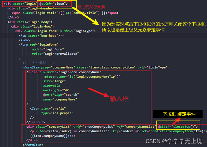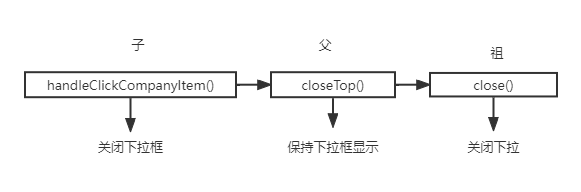 说明:这里一共绑定了三个事件,①是给最外层父级元素绑定close事件,②是给下拉框绑定closeTop事件,③是给下拉框的子项绑定handleClickCompanyItem事件。作用解释如下: