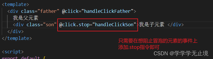 <div class="son" @click="handleClickSon">我是子元素 </div>