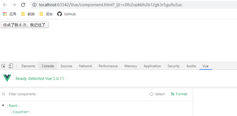 效果与刚才的全局注册是类似的,不同的是,这个counter组件只能在当前的Vue实例中使用