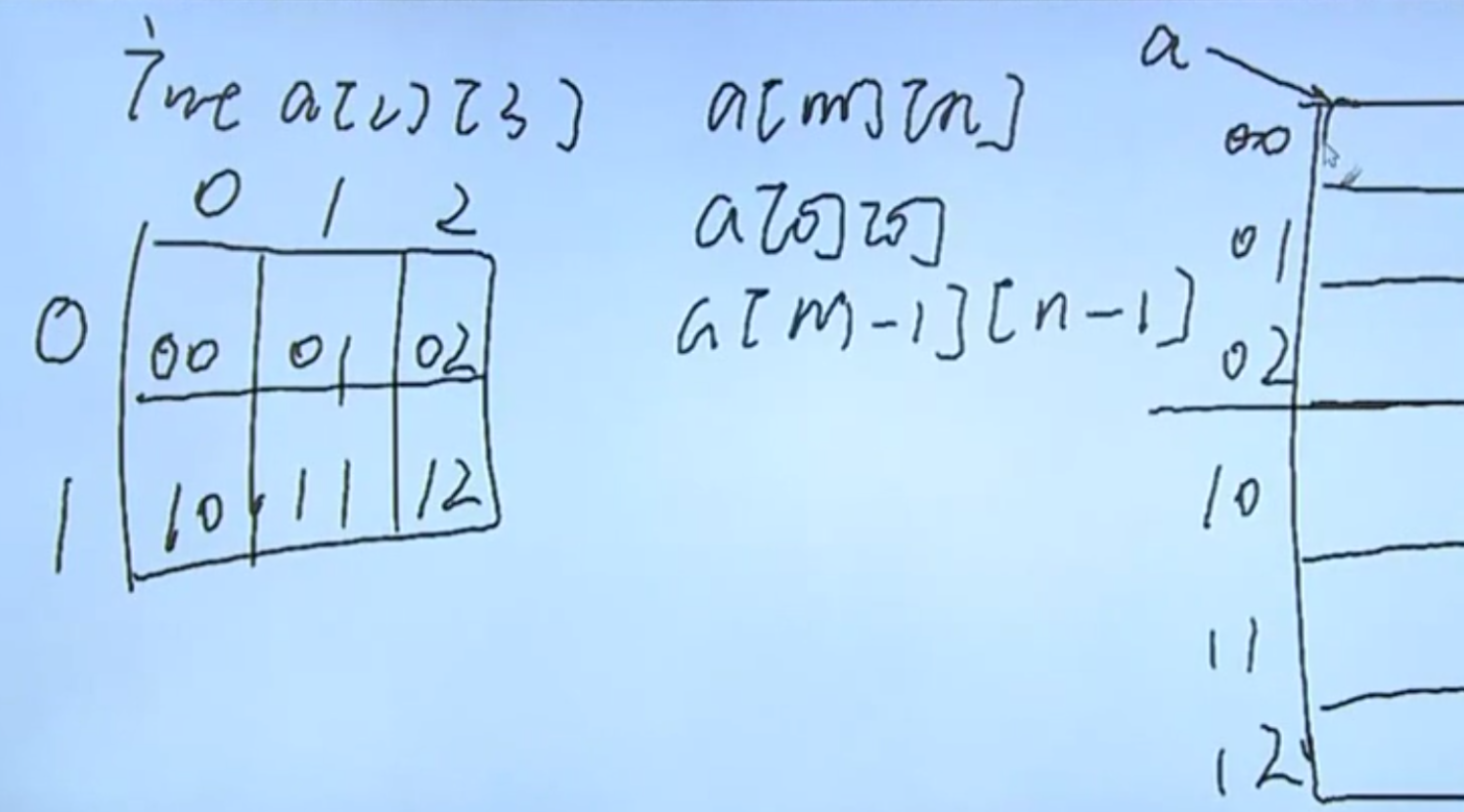 二维数组的存储是按行存储,先存第一行,存完后再存储第二行。二位数组仍然是连续的一片存储空间,其中数组名代表数组的开头,a[0][0]