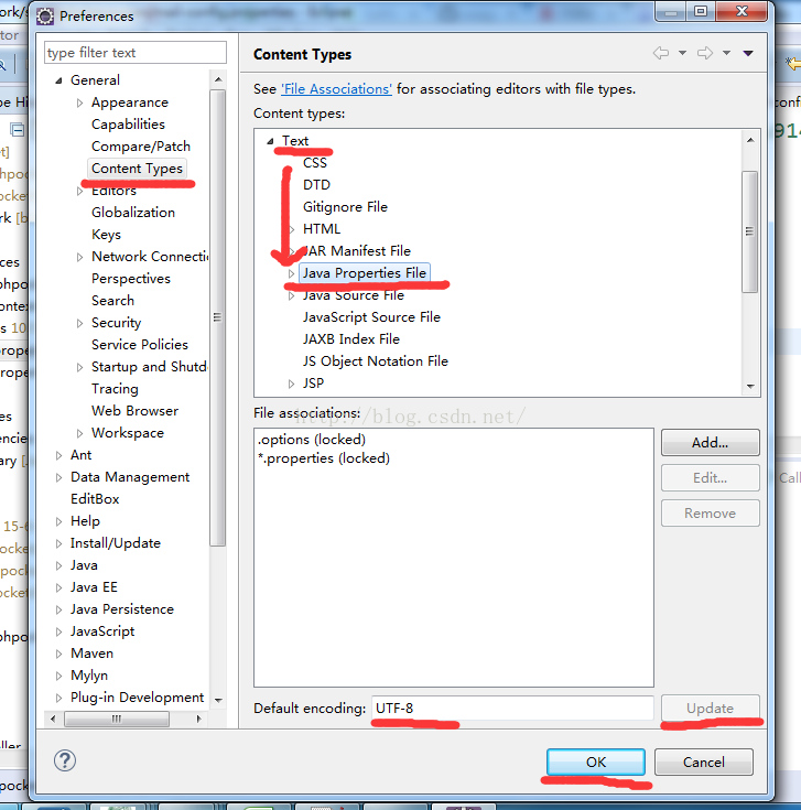 window---->preferences---->general----->content types----->Text------>java properties file---->UTF-8---->update ------>ok