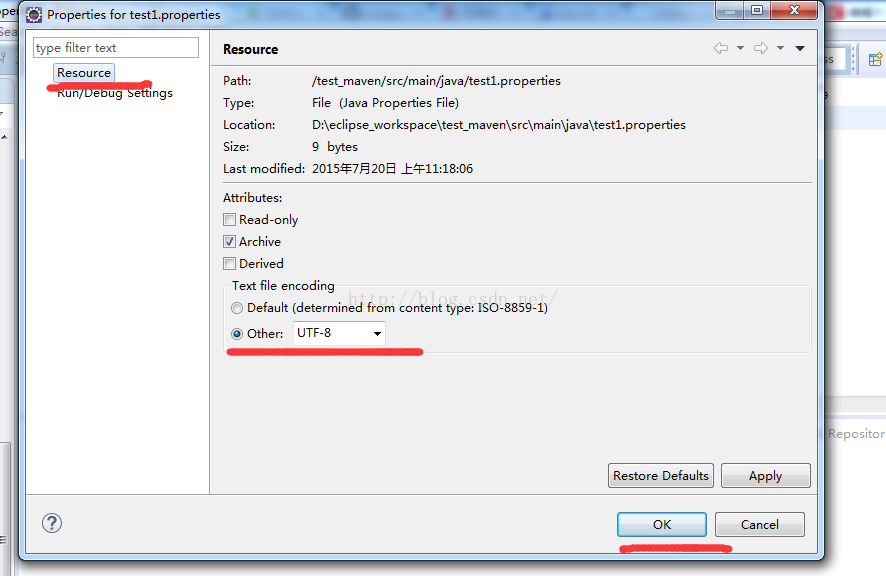 右击属性文件---->属性------->resource----->text file encoding------>选择other utf-8