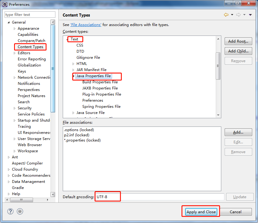 第一步:选中Window >> Preferences >> Gengeral >> Content Types ,之后可以在右边看到Text >> Java Properties File,将Default Encoding设置成UTF-8,如下图所示: