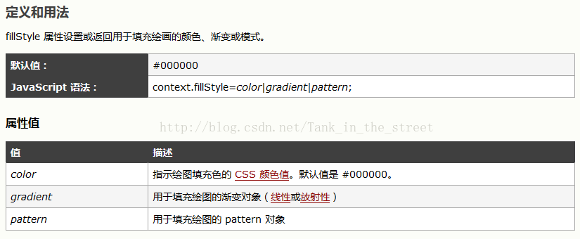 fillStyle()方法也是用的比较多的,它用于设置或返回用于填充绘画的颜色、渐变或模式,有三种不同的属性值,它的定义和用法如何下图所示: