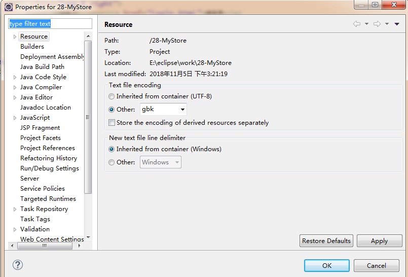 今天向eclipse中导入了一个项目,我的eclipse本身默认编码方式是UTF-8,而这个项目的编码是gbk,所以很自然的,代码文件中的中文变成了乱码,于是右击项目名称,点击-->Properties,将文件编码改成gbk.。(这种方式哦是将该项目的编码方式改变,其他项目并不修改)