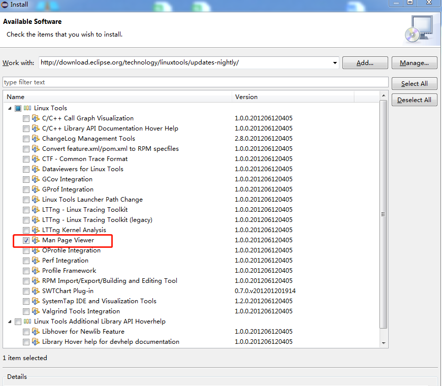 安装地址:http://download.eclipse.org/technology/linuxtools/updates-nightly/