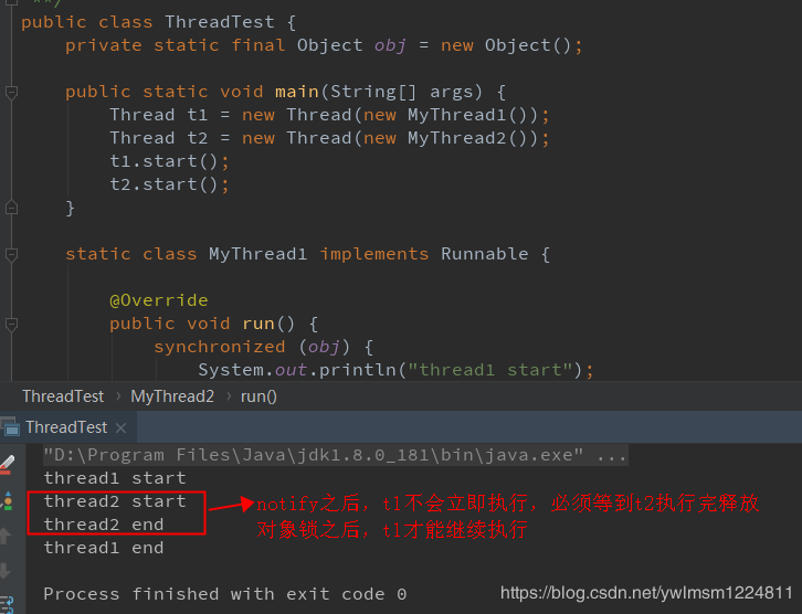 wait 方法是属于 Object 类中的,wait 过程中线程会释放对象锁,只有当其他线程调用 notify 才能唤醒此线程。wait 使用时必须先获取对象锁,即必须在 synchronized 修饰的代码块中使用,那么相应的 notify 方法同样必须在 synchronized 修饰的代码块中使用,如果没有在synchronized 修饰的代码块中使用时运行时会抛出IllegalMonitorStateException的异常