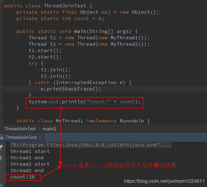 等待调用join方法的线程结束之后,程序再继续执行,一般用于等待异步线程执行完结果之后才能继续运行的场景。例如:主线程创建并启动了子线程,如果子线程中药进行大量耗时运算计算某个数据值,而主线程要取得这个数据值才能运行,这时就要用到 join 方法了