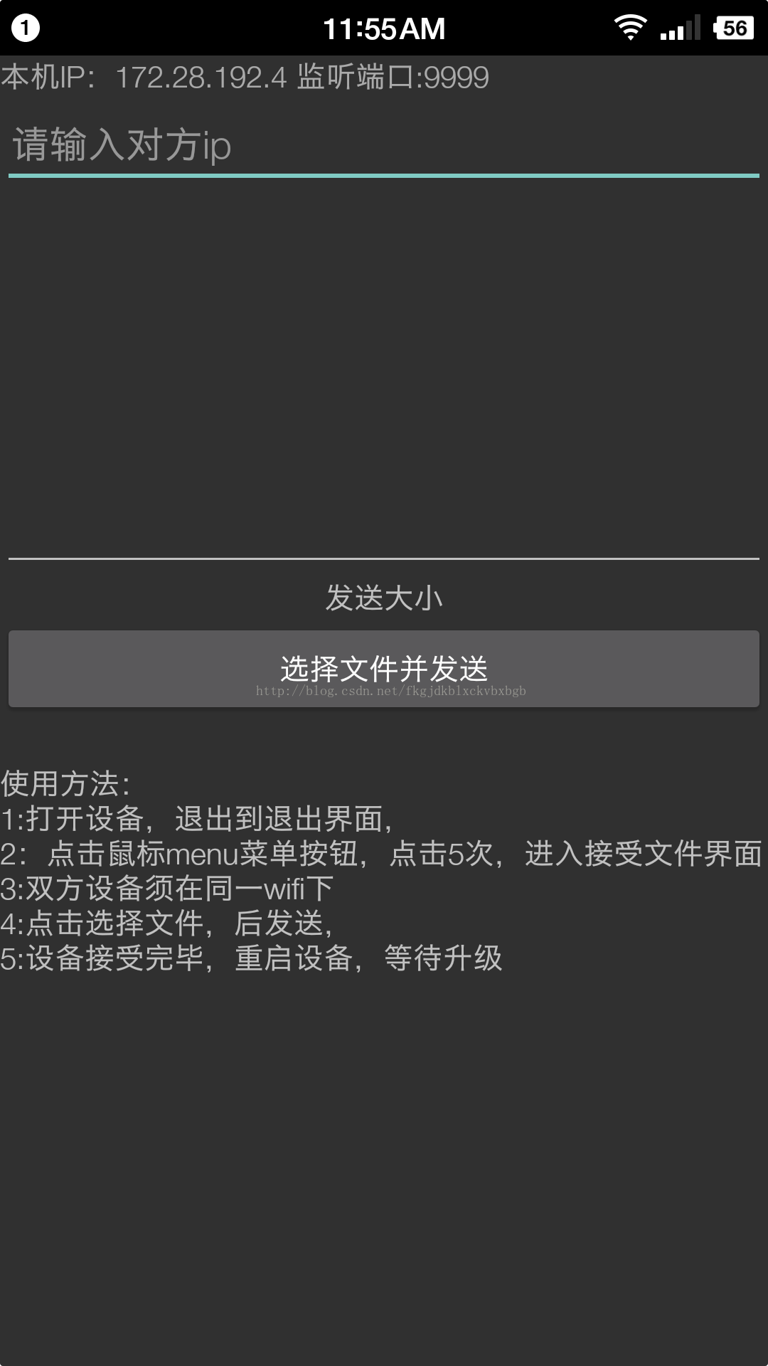 <LinearLayout xmlns:android="http://schemas.android.com/apk/res/android" xmlns:tools="http://schemas.android.com/tools" android:layout_width="match_parent" android:layout_height="match_parent" android:background="@color/black" android:orientation="vertical" tools:context=".MainActivity"> <TextView android:id="@+id/tvMsg" android:layout_width="match_parent" android:layout_height="wrap_content" android:focusable="false" android:focusableInTouchMode="false" android:textColor="@color/white" /> <EditText android:id="@+id/txtIP" android:layout_width="match_parent" android:layout_height="wrap_content" android:layout_centerVertical="true" android:contentDescription="目标IP地址" android:ems="10" android:hint="请输入对方ip" android:textColor="@color/white" /> <EditText android:id="@+id/et" android:layout_width="match_parent" android:layout_height="180dp" android:layout_alignLeft="@+id/txtIP" android:clickable="false" android:editable="false" android:ems="10" android:focusable="false" android:focusableInTouchMode="false" android:gravity="center_vertical|left|top" android:inputType="textMultiLine" android:longClickable="false" android:scrollbarAlwaysDrawVerticalTrack="true" android:scrollbarStyle="insideInset" android:scrollbars="vertical" android:textColor="@color/white" android:textSize="15dp"> <requestFocus /> </EditText> <TextView android:id="@+id/send_progress" android:layout_width="match_parent" android:layout_height="wrap_content" android:gravity="center" android:text="发送大小" android:textColor="@color/white" /> <Button android:id="@+id/btnSend" android:layout_width="match_parent" android:layout_height="wrap_content" android:layout_alignLeft="@+id/txtPort" android:layout_below="@+id/et" android:text="选择文件并发送" android:textColor="@color/white" /> <TextView android:layout_width="wrap_content" android:layout_height="wrap_content" android:layout_marginTop="@dimen/dimen_20" android:text="使用方法:n1:打开设备,退出到退出界面,n2:点击鼠标menu菜单按钮,点击5次,进入接受文件界面n3:双方设备须在同一wifi下n4:点击选择文件,后发送,n5:设备接受完毕,重启设备,等待升级" android:textColor="@color/white" /> </LinearLayout>