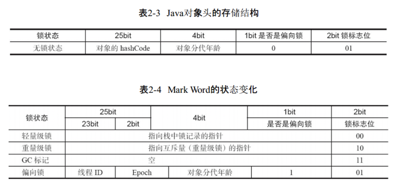 synchronized用的锁是存在Java对象头里的。如果对象是数组类型,则虚拟机用3个字宽(Word)存储对象头,如果对象是非数组类型,则用2字宽存储对象头。