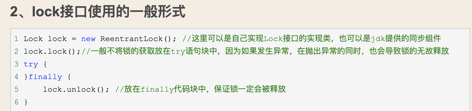 由于lockInterruptibly()的声明中抛出了异常,所以lock.lockInterruptibly()必须放在try块中或者在调用lockInterruptibly()的方法外声明抛出InterruptedException。因此lockInterruptibly()一般的使用形式如下: