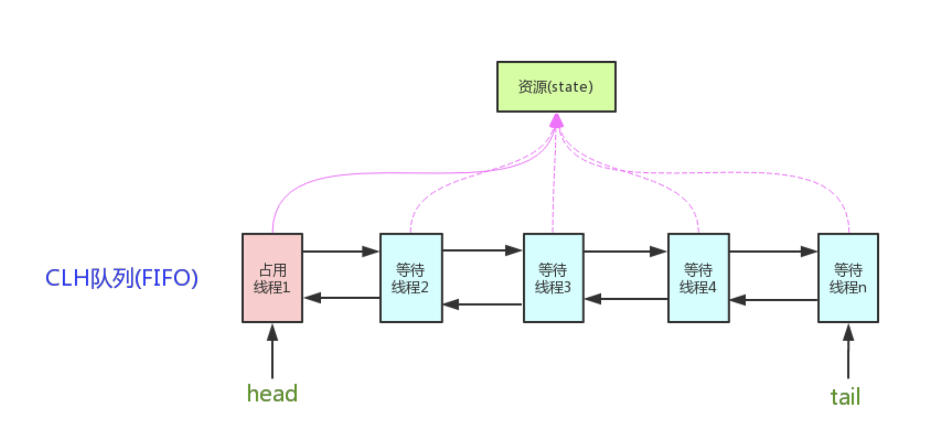 ReentrantLock主要利用CAS+AQS队列来实现。AQS是抽象的队列式的同步器,AQS定义了一套多线程访问共享资源的同步器框架,它维护了一个volatile int state(代表共享资源)和一个FIFO线程等待队列(多线程争用资源被阻塞时会进入此队列)。AbstractQueuedSynchronizer通过构造一个基于阻塞的CLH队列容纳所有的阻塞线程,而对该队列的操作均通过Lock-Free(CAS)操作。
