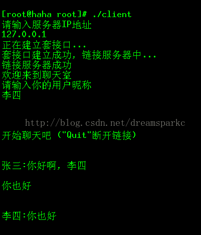 - Client端输入quit退出连接,server端提示client退出。