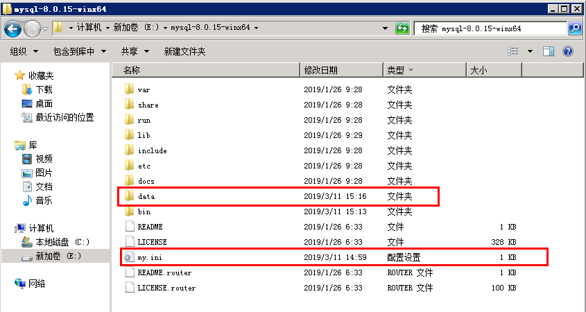 解压之后的地址,目录。其中data是接下来的操作里生成的,my.ini是我们需要添加的。下面一一说明