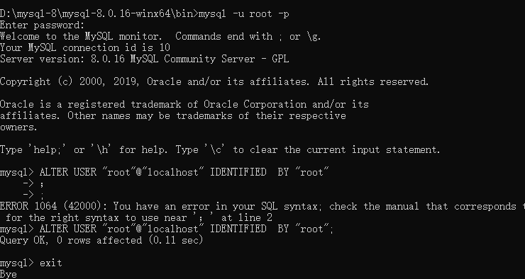ALTER USER "root"@"localhost" IDENTIFIED BY "root"; (别忘了分号,用于修改密码为root,你的密码可以自己设定)