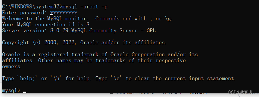 9.关闭命令提示符窗口,重新以管理员身份打开,根据8中的命令重新登录,密码为上一步修改的密码。
