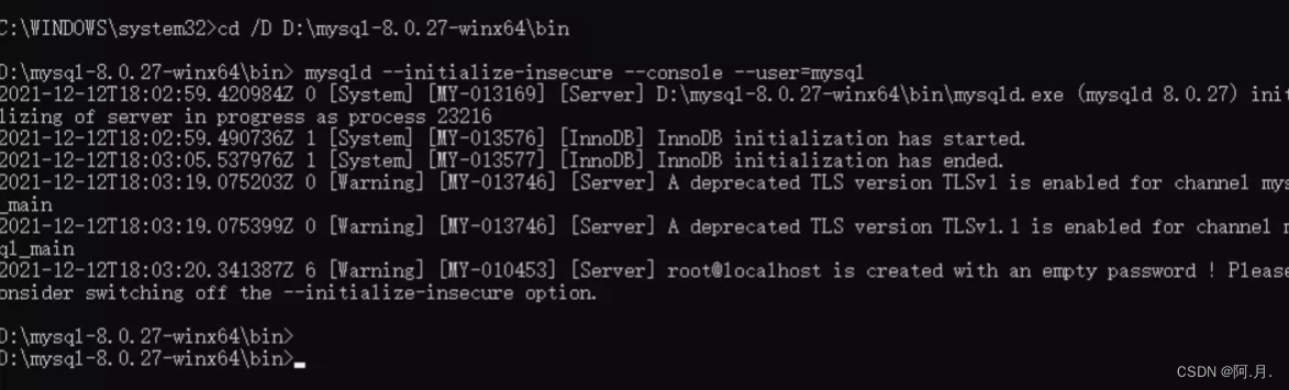 5.输入 mysqld --initialize-insecure --console --user=mysql [回车] 初始化安装信息