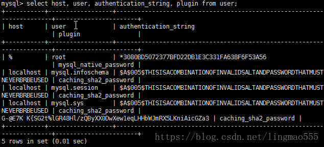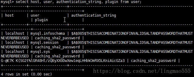 select host, user, authentication_string, plugin from user;