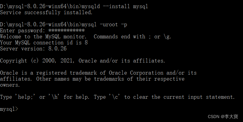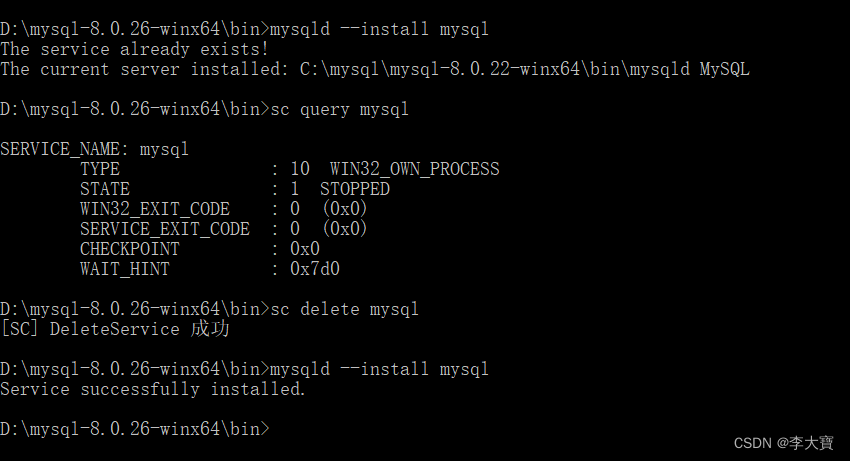 注意:要出现The service already exists!,因为在之前已经安装过mysql并且在卸载时没有删除干净,解决方案: