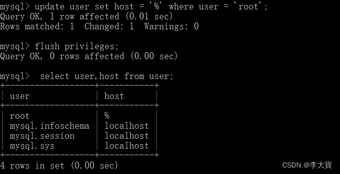 3、修改表后并不会生效,需要执行以下sql使用修改生效。flush privileges;