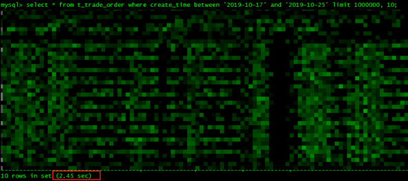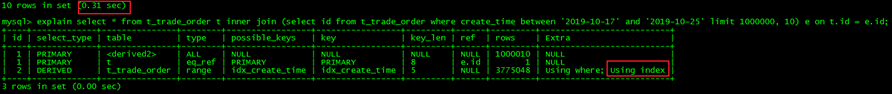 1.使用覆盖索引,select id from t_trade_order where create_time between '2019-10-17' and '2019-10-25' limit 1000000, 10,查询结果放弃前1000000行,返回10行,查询出符合查询范围的id