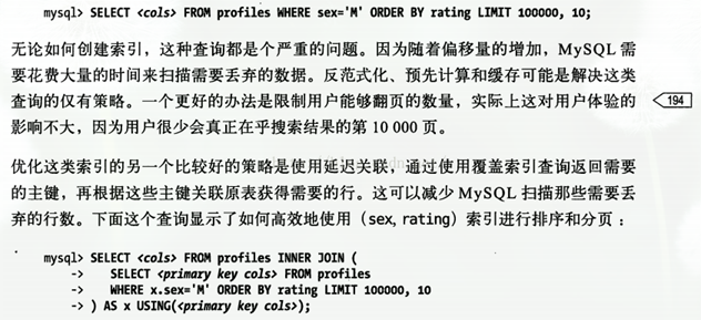 延迟关联优化:通过使用覆盖索引查询返回需要的主键,再根据主键关联原表获得需要的数据。