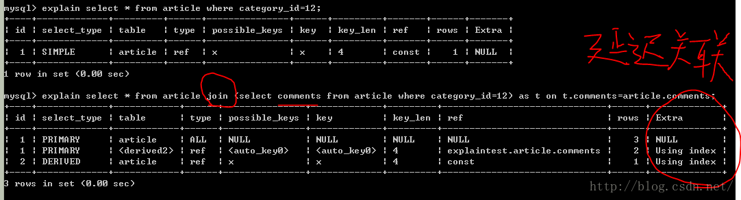 explain select * from article join (select comments from article where category_id=12) as t on t.comments=article.comments;