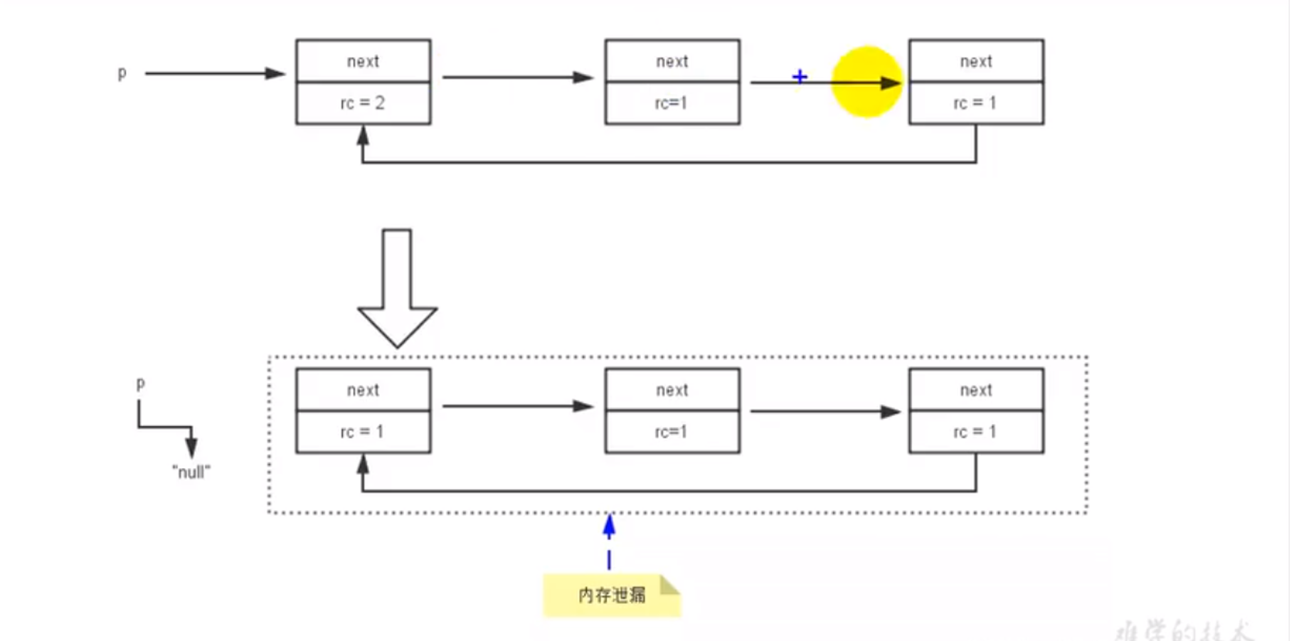 当P指针断开连接时 此时无法回收 造成内存泄漏。