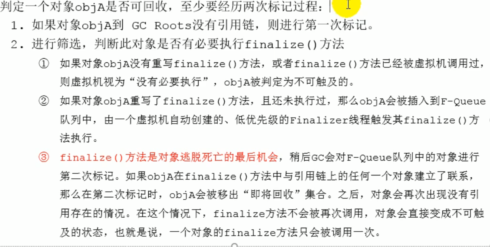 1. 当一个对象被回收之前,垃圾回收器会调用这个对象的finalize方法。finalize方法允许在字类中重写,用于在对象被回收时进行资源释放。通常在这个方法中进行一些资源释放和清理的工作,比如关闭文件、套接字和数据库连接等。